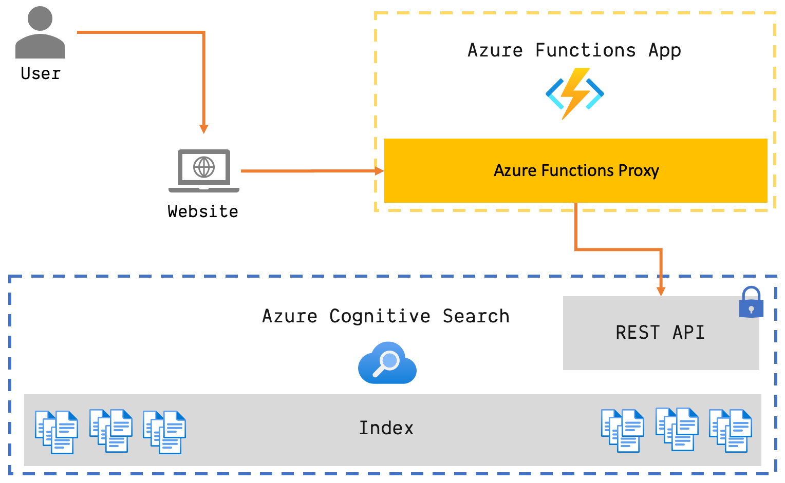 You send search requests through an Azure Functions Proxy to Azure Cognitive Search. The proxy modifies the incoming HTTP request. It adds different metadata to the request before sending it to the Search API. This approach has several advantages:
