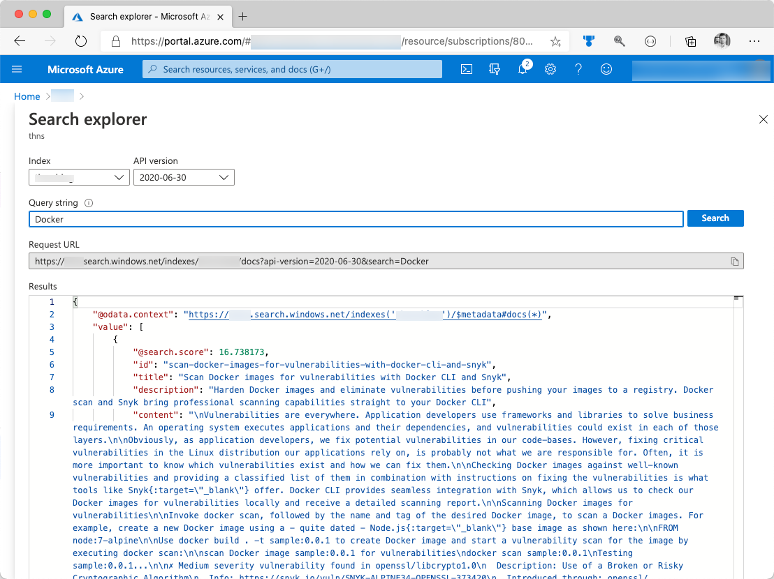 You can already interact with the search service and query your dataset. Use the Search Explorer in Azure Portal and make yourself comfortable with the query syntax. You may also want to dive deeper and use advanced query techniques that go beyond just searching. Take a look at the corresponding pages in the docs like “Advanced queries in Azure Cognitive Search” for example.