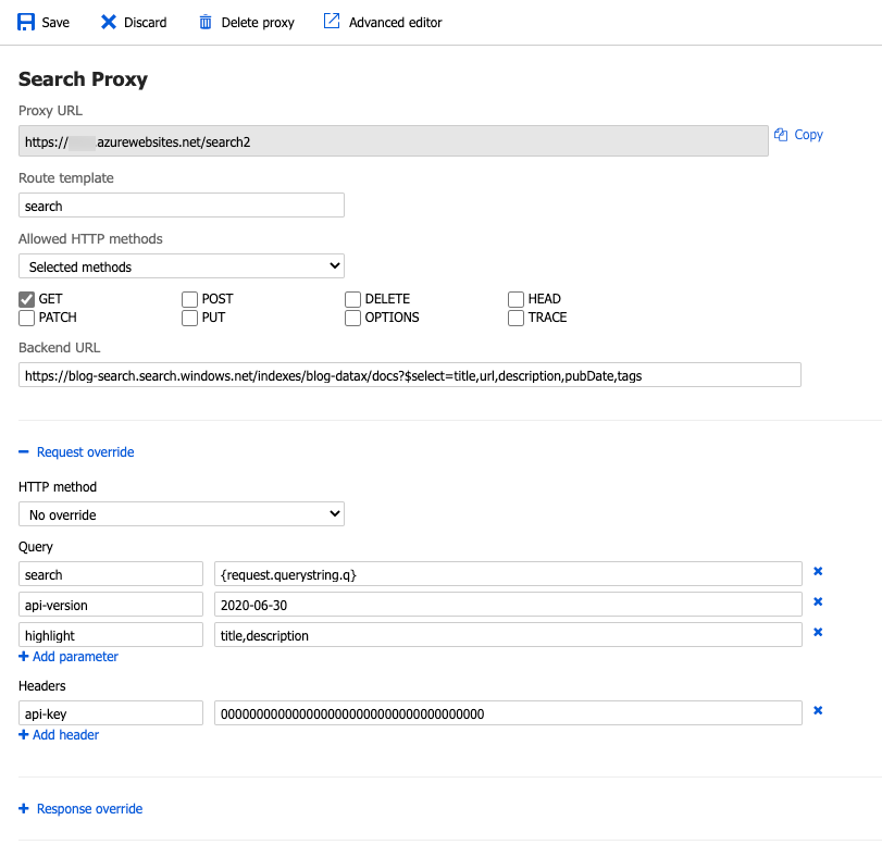 Having all the required metadata in place, you can configure the proxy function to grab the provided search query from the query string. Forward the query together with the desired api-version, the api-key and the hit highlighting configuration to Azure Cognitive Search. The final configuration of your proxy function should look like shown in the following picture: