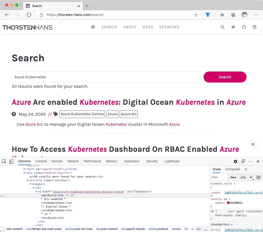 Take a closer look at the result object. Previously, we configured hit highlighting; Azure Cognitive Search provides all hits as part of the @search.highlights property. Per property, you find a bunch of HTML where all hits are marked using an <em></em> tag. For my blog, I display hits using the accent color.