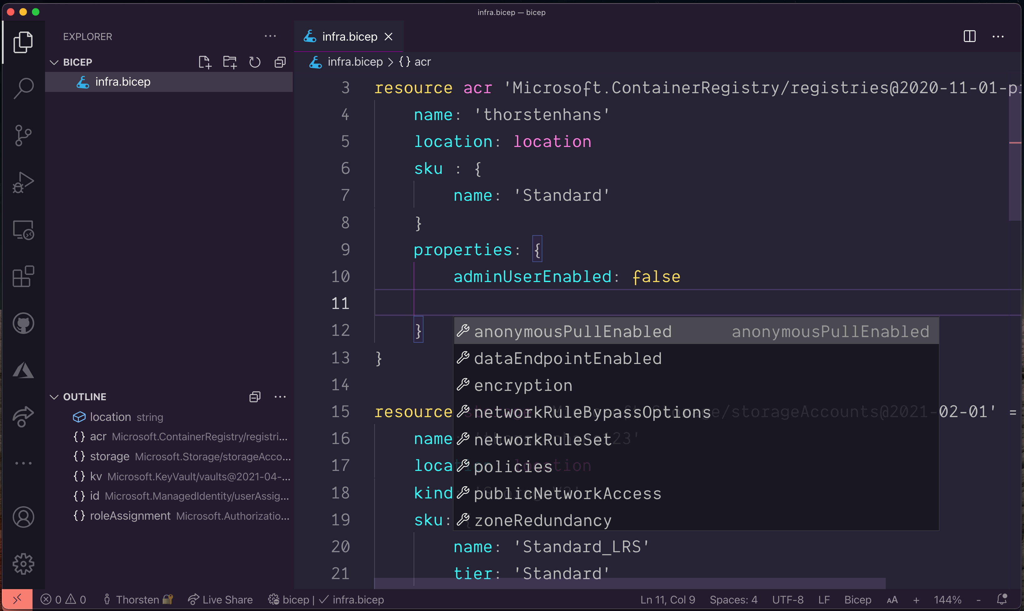 Although Bicep is so new, their coding assistance already outperforms Terraform. Referencing existing elements, auto-completion, and validation works for me like a charm. At least as long as all infrastructure belongs to a single file.