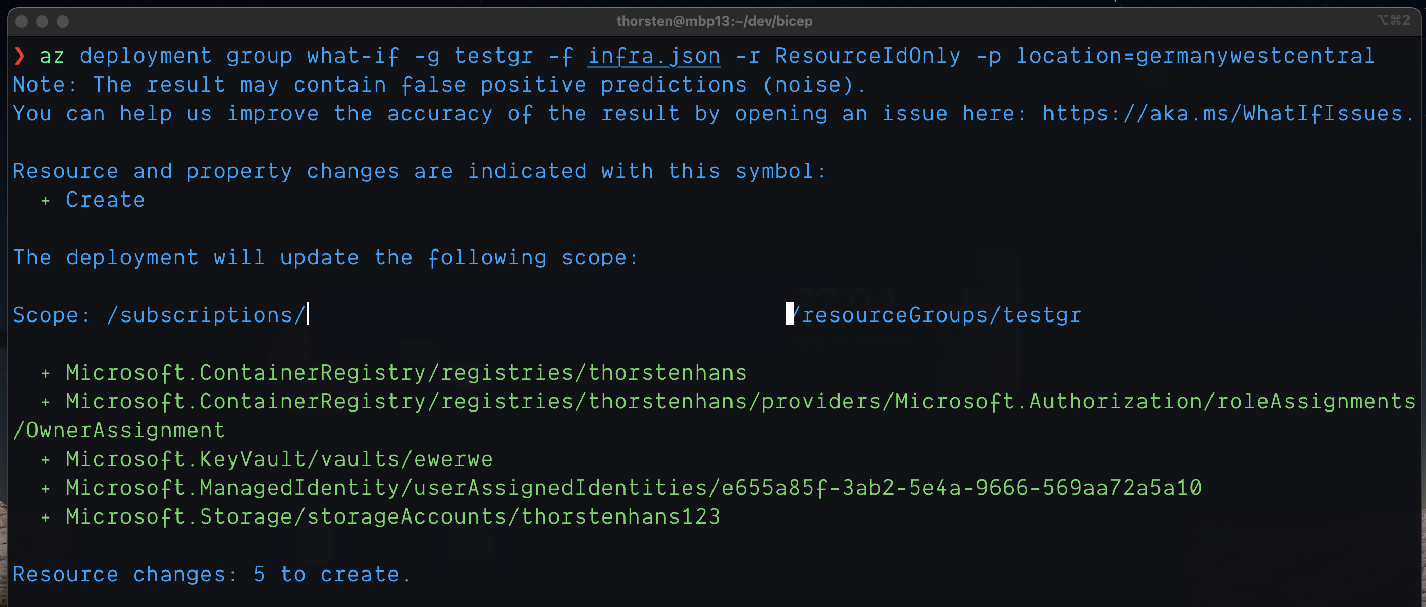 In contrast, Bicep defaults to incremental deployments like underlying ARM Templates. Incremental deployments may add or modify Azure services on a configurable scope (Resource Group, Subscription, Management Group, or Tenant). Relying on incremental deployments, Bicep will never delete a service instance from Azure when you remove it from your source code.