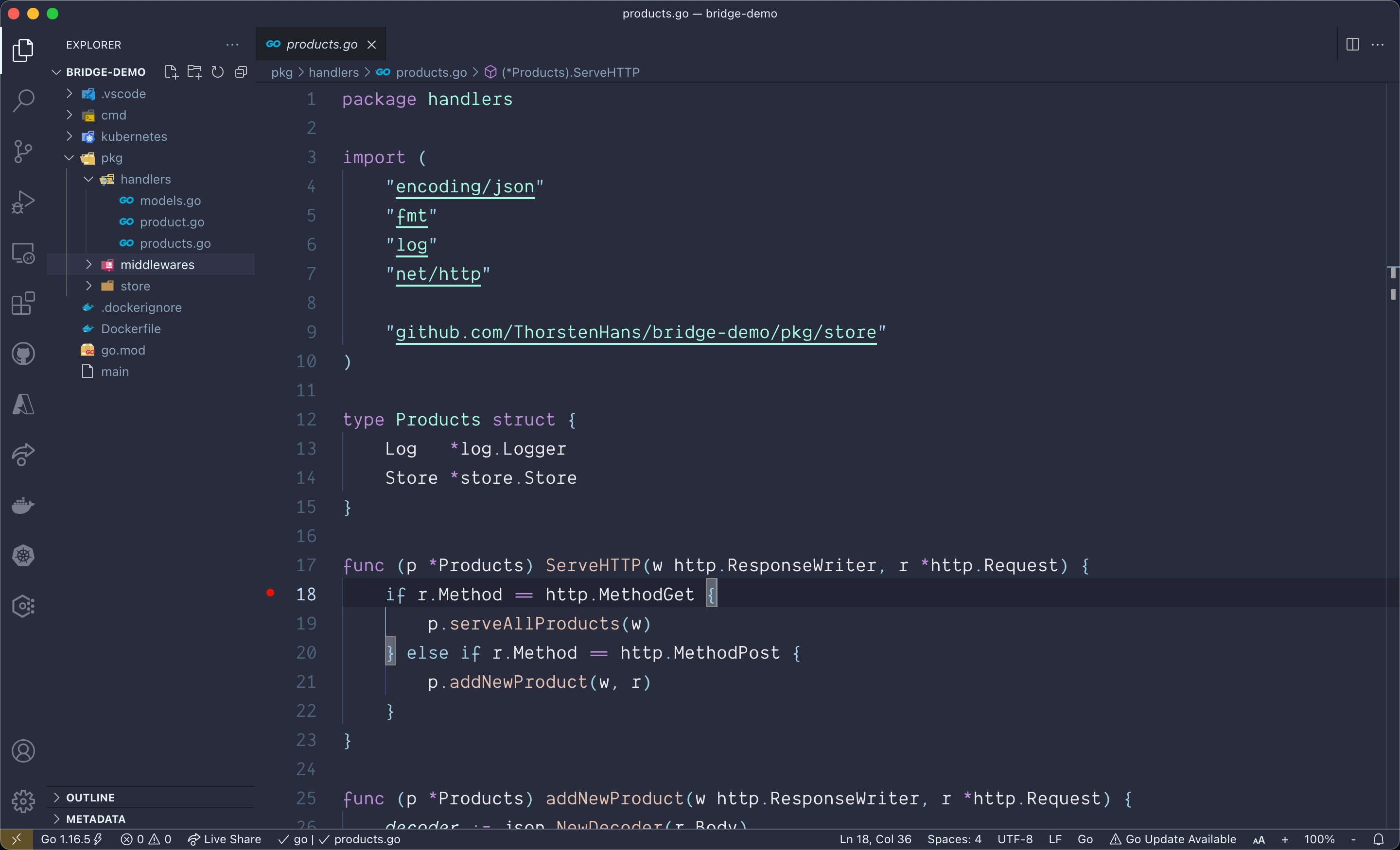 Let’s add a new breakpoint to verify debugging works as expected. Open pkg/handlers/products.go and add a breakpoint in line 18 as shown in the following figure.