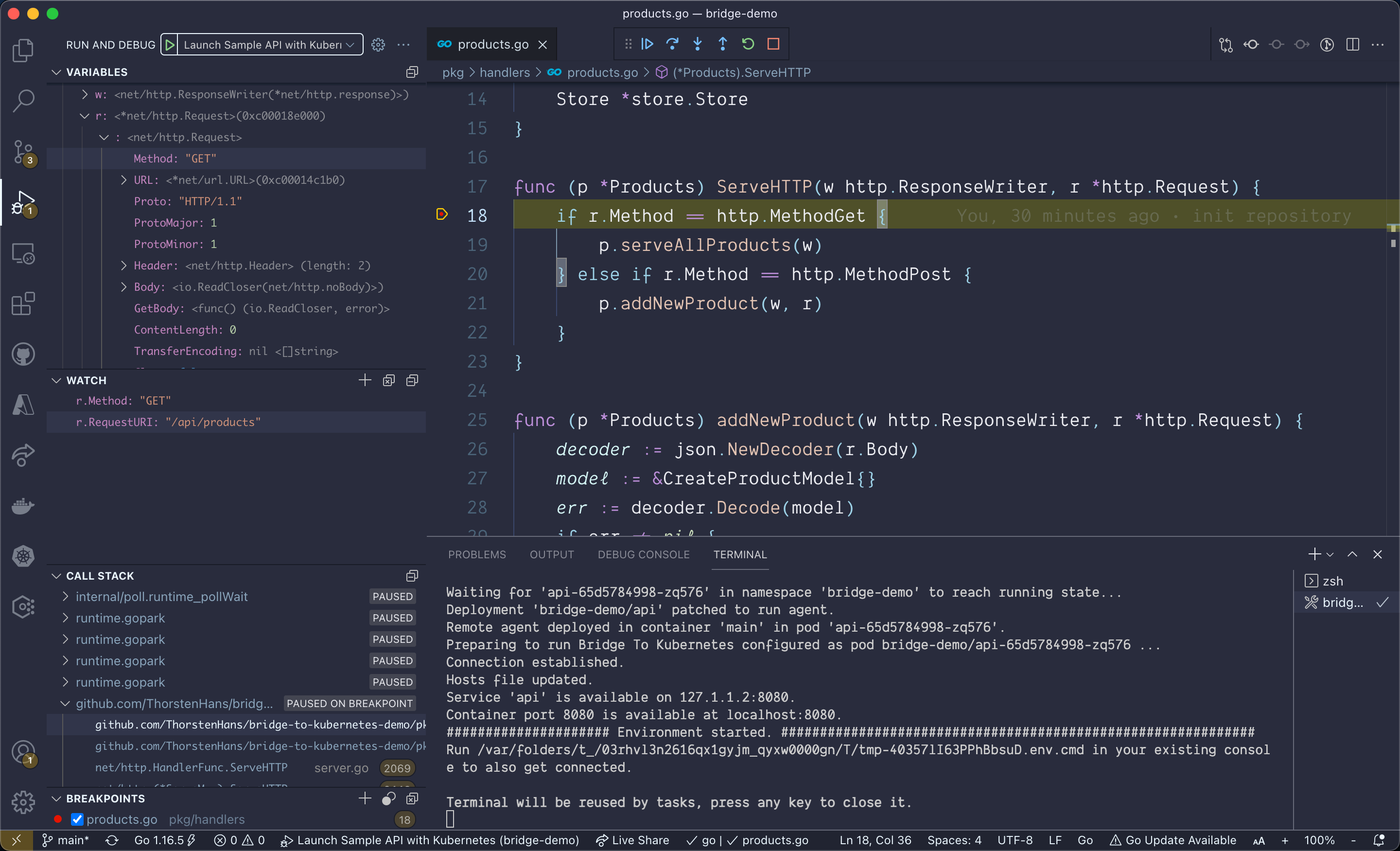 At this point, your VSCode instance should already be waiting at the breakpoint and you can debug the request issues to the Kubernetes cluster locally on your machine as shown in the following picture.