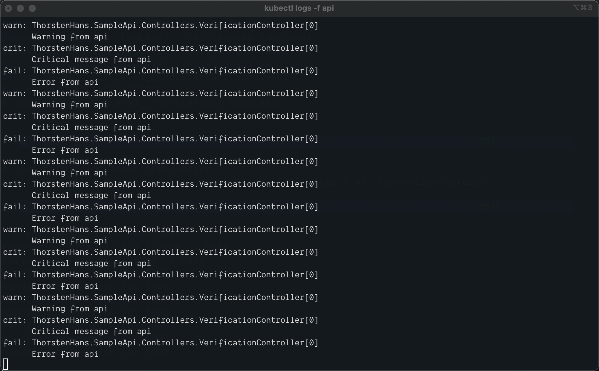 To do so, let’s now build the necessary ConfigMap and specify which logs should be written to STDOUT. In contrast to the default behavior, we want our application to include logs of level Debug and higher when logs are produced from within the C# namespace ThorstenHans.SampleApi: