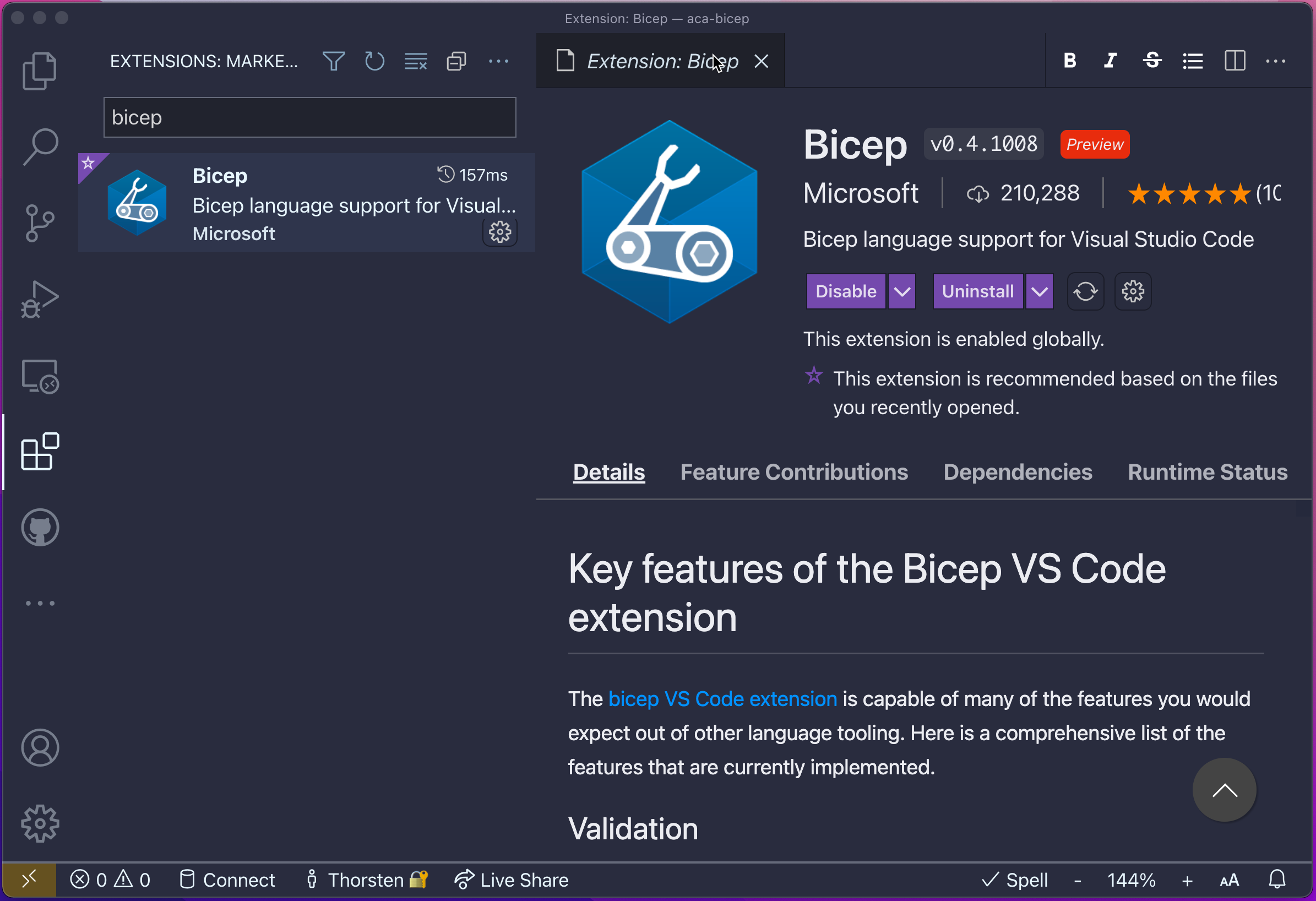Launch the Extension View from the Activitiy Bar (or just press Cmd+Shift+X). Search for Bicep and install it if necessary.
