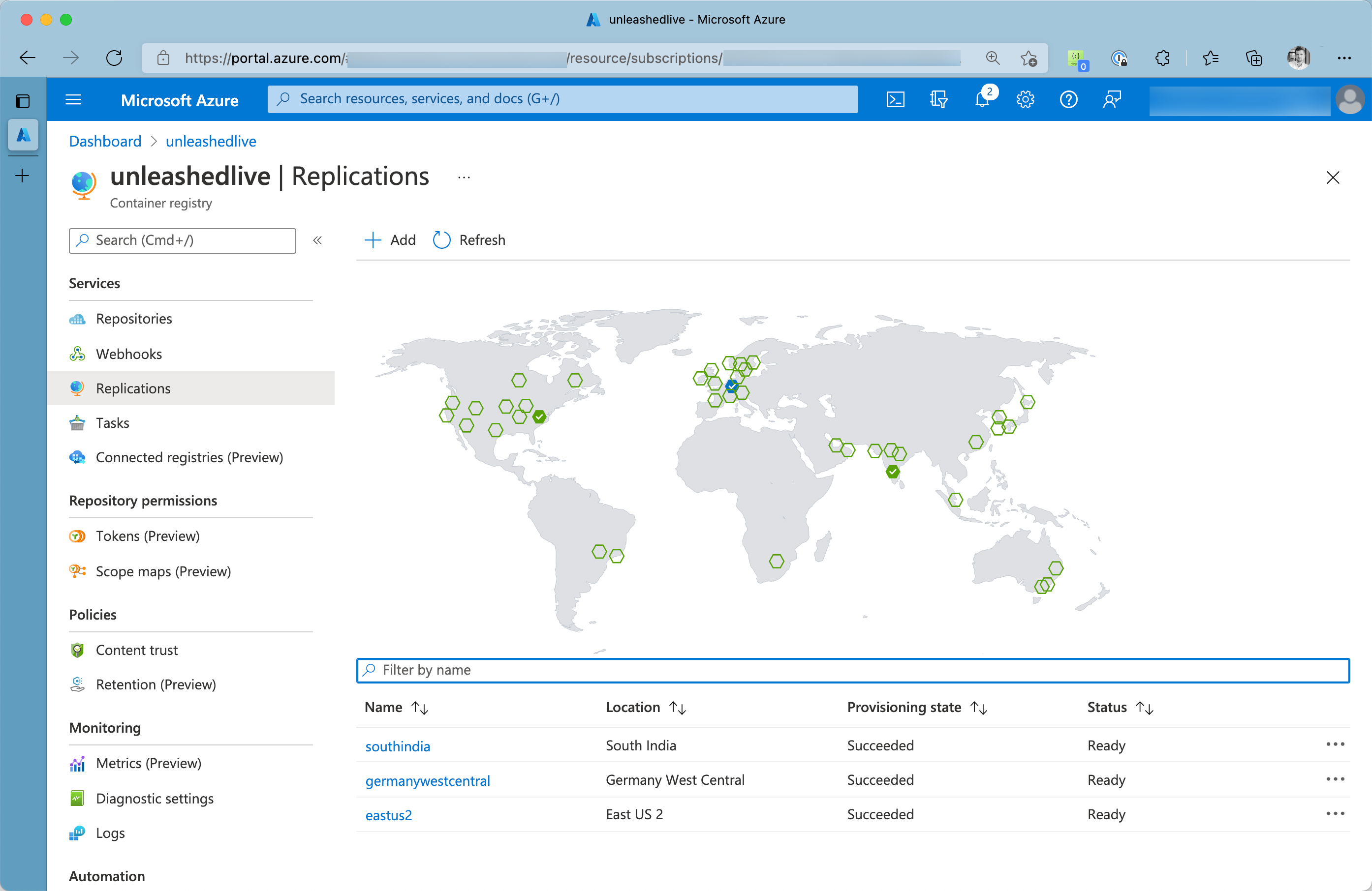 You can update any geo-replication to change the endpoint configuration or update its tags. For demonstration purposes, we’ll activate the endpoints for the replication we created previously (unleashedindia):