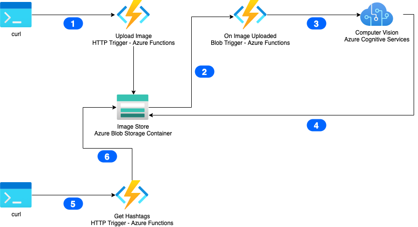 OnImageUploadedfunction triggers for every new blob in the/imagescontainer - Azure Computer Vision is asked to do image analysis and generate tags for the given image