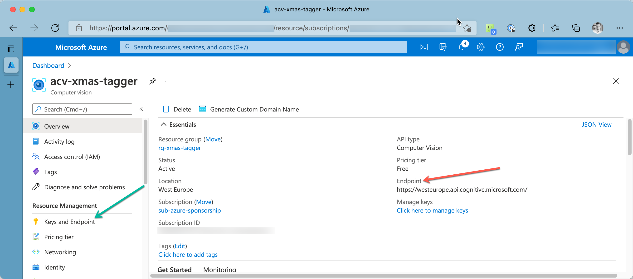 Although the provision.sh script pre-configured all necessary settings on the Azure Functions instance, you should verify them at this point. Locate the endpoint URI and the subscriptionKey (called Key 1 in the Keys and Enpoints blade) using Azure Portal by browsing your instance of Azure Computer Vision:
