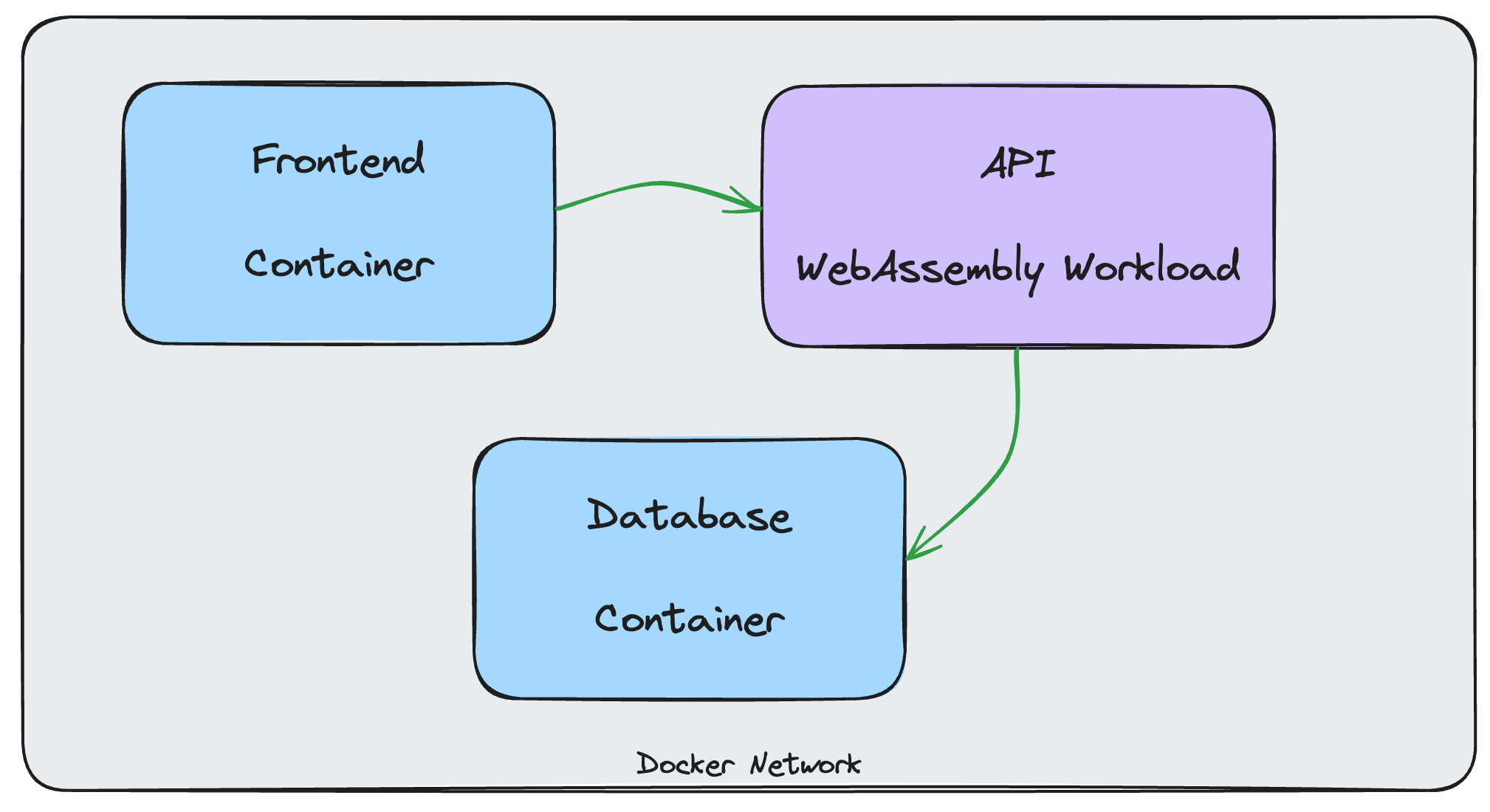 Discovering new topics, or learning emerging technologies often goes best when looking at a practical example. For the sake of this article, we’ll start with a simple Hello, World. From there, we’ll move on and orchestrate a simple three-tier application consisting of two containers (frontend and postgres) and a Wasm module (api).