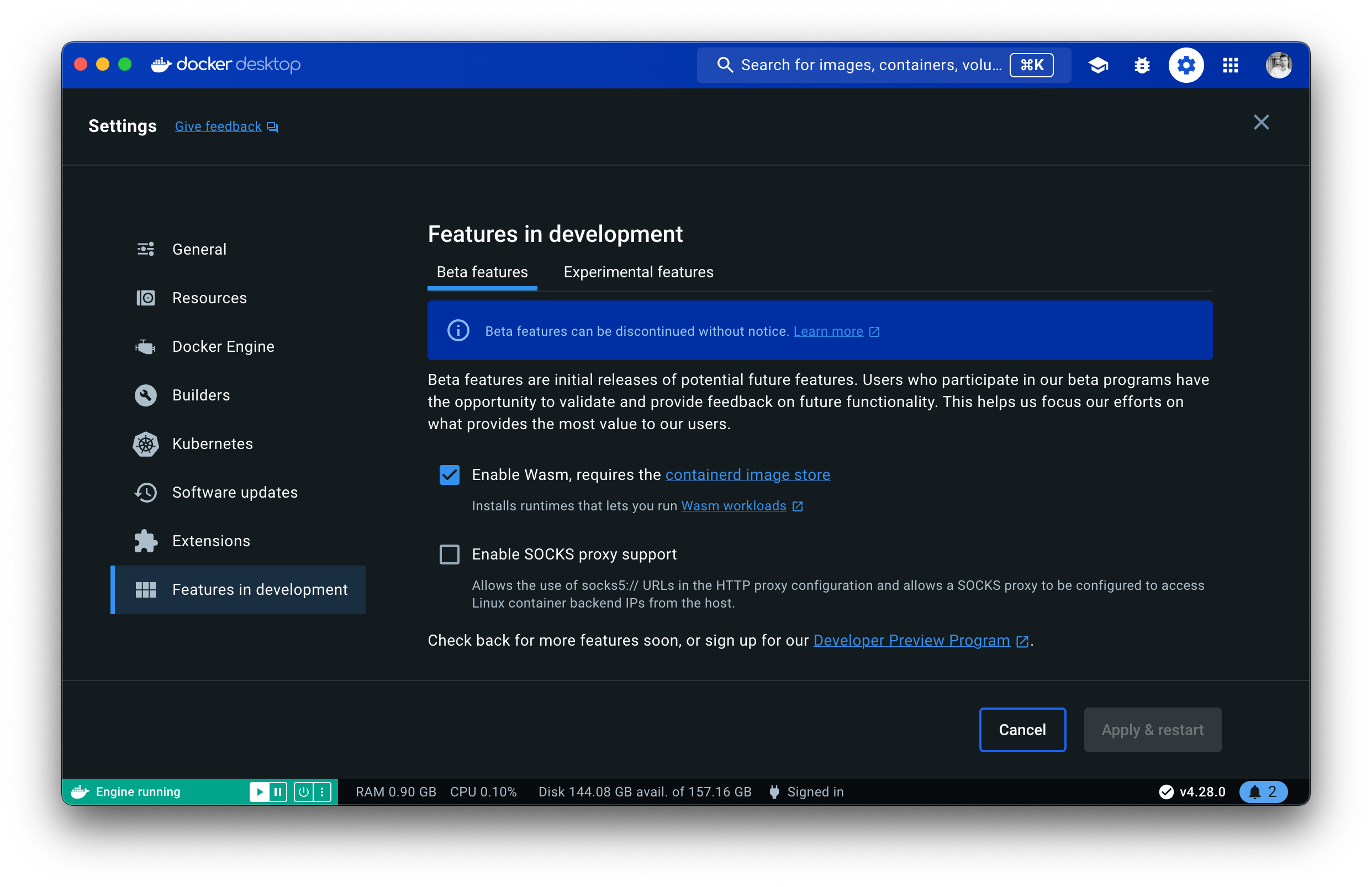 Beta Feature: Wasm workloads in Docker Desktop is currently marked as a beta feature.